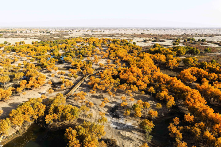 这是2025年10月19日拍摄的新疆和田地区洛浦县洛滨胡杨林景区风光(无人机照片)ღ★。新华社记者 辛悦卫 摄