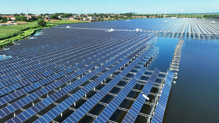 2025年7月30日在辽宁省铁岭市铁岭县大青水库拍摄的光伏发电板(无人机照片)ღ★。新华社记者 杨青 摄